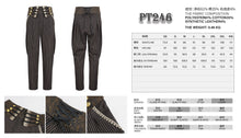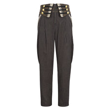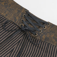 - The main material is brown striped fabric, and the waist is made of irregular brown washed fabric with gold lace and black webbing, and is decorated with gold buttons.