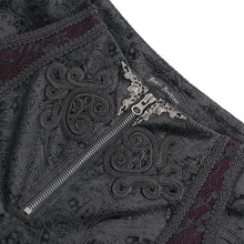- The main fabric is made of retro pattern embossed velvet, spliced with black and red lace, and metal sticker are used to embellish the details.