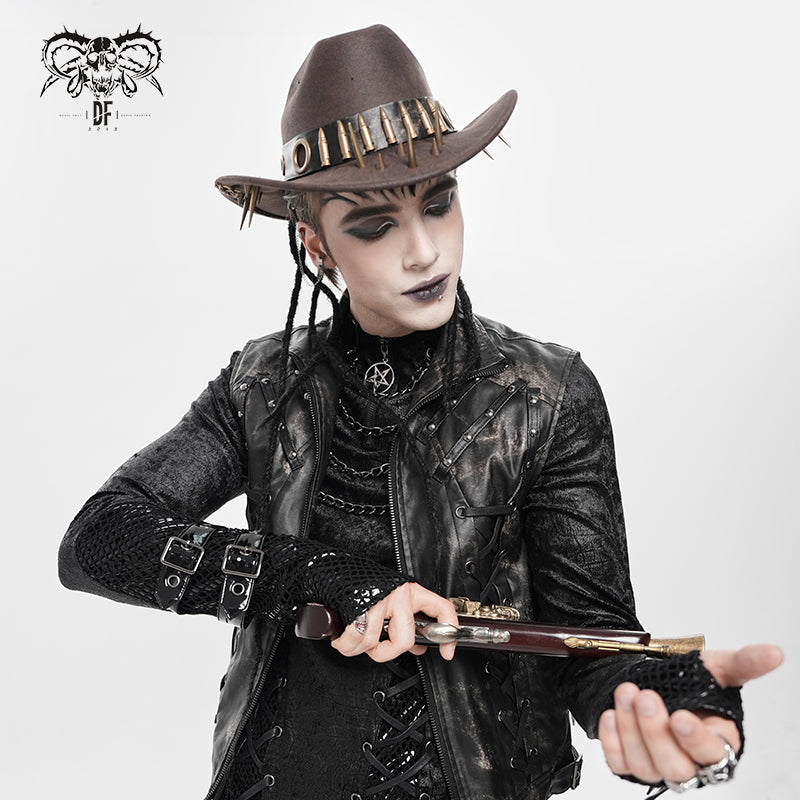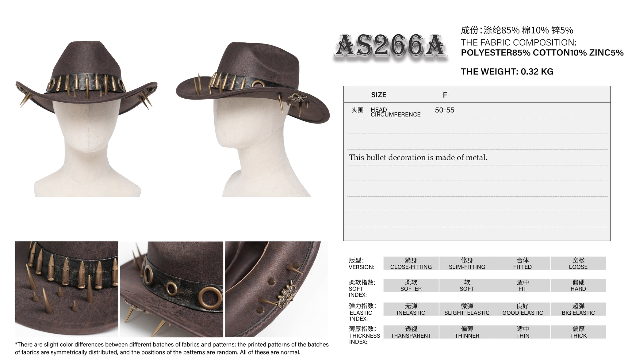 - There is a sheep horn skull metal plate and metal spikes on the raised brim.