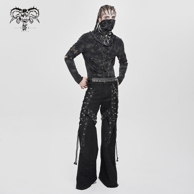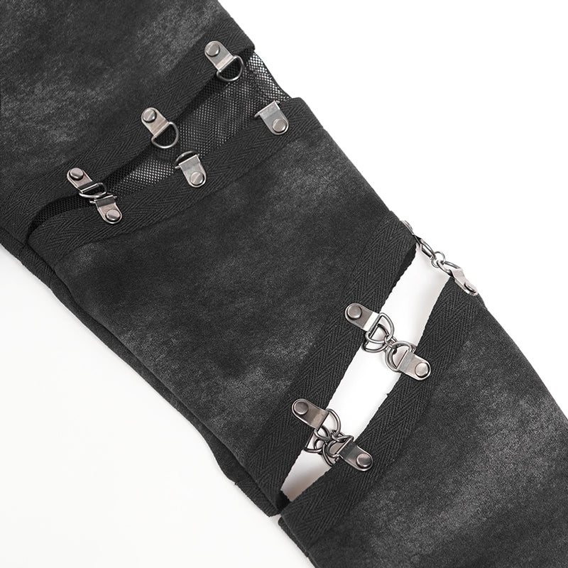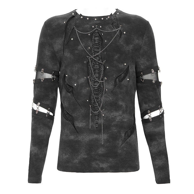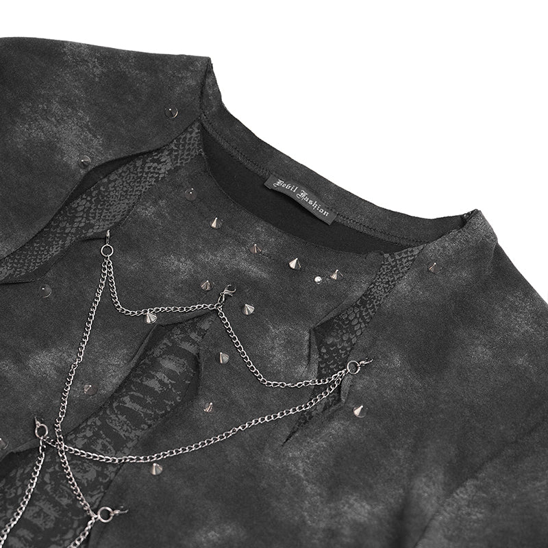 - The main fabric is a batik-like stretch knit with a ripped front panel, spliced with a stretch patterned woven fabric, embellished with small spikes, and interwoven with irregular chains.