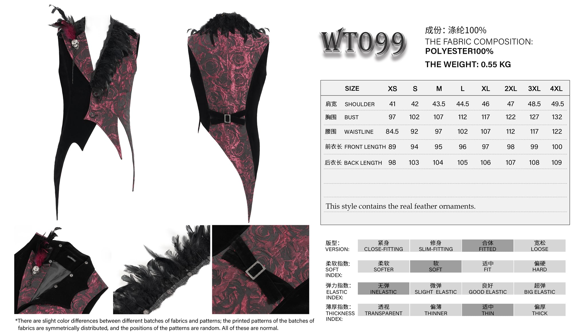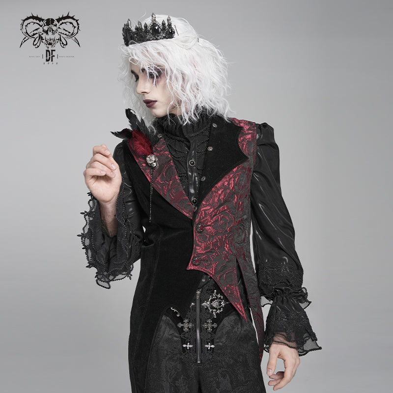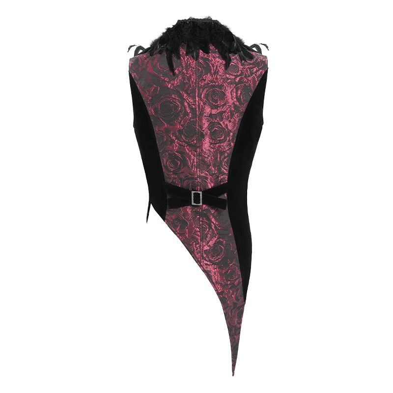 • This vest is made of asymmetrical black and red rose jacquard and black velvet.