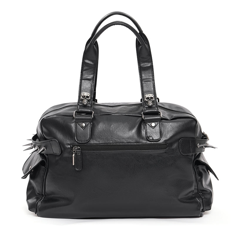- Leather bag, decorated with metal skull spikes, can be carried by hand or worn as a crossbody bag.