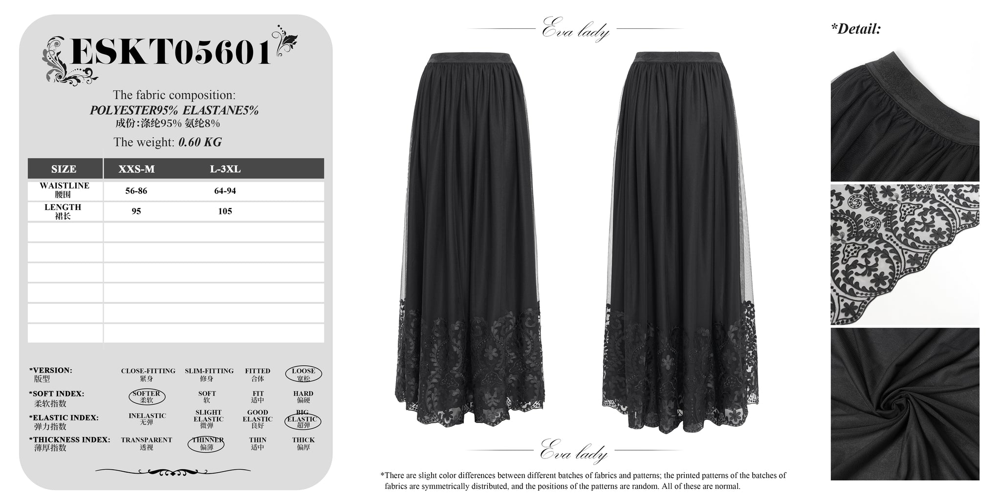 - The hem of the upper layer of the skirt is embroidered with appliqués, and the inner layer is made of high-density mesh, which protects privacy while maintaining breathability.