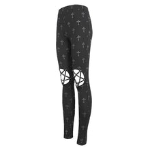 - Knitted leggings with cross print, with cutouts at the knees, five-pointed stars made of elastic fabric strips, and nails at the cross.