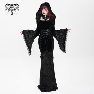 SKT24001 Black Long Trumpet Sleeve Gothic Fishtail Hooded Dress