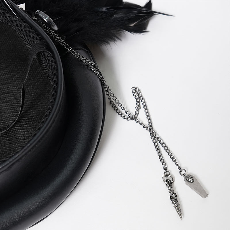 - The imitation leather military cap is decorated with a large amount of chicken feathers, the ribbon is hand-sewn with rivets and sheep-horn ghost head decorative plates, the two sides are hand-sewn with carved metal buckles, and the hanging chains are hung with spikes and coffin pendants.
