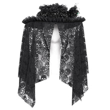 - A black Gothic hat with a big brim, a skull flower mesh hanging on it, multiple circles of lace on the top of the hat, diamond jewelry decoration on it, and three-dimensional flower decoration on the side.