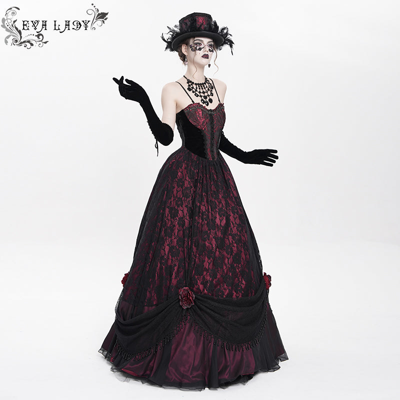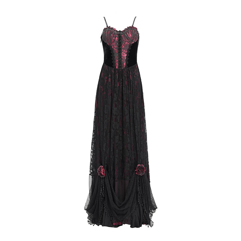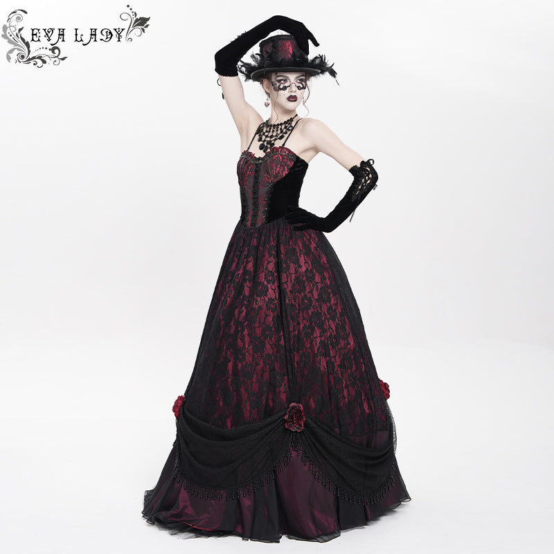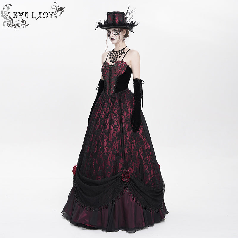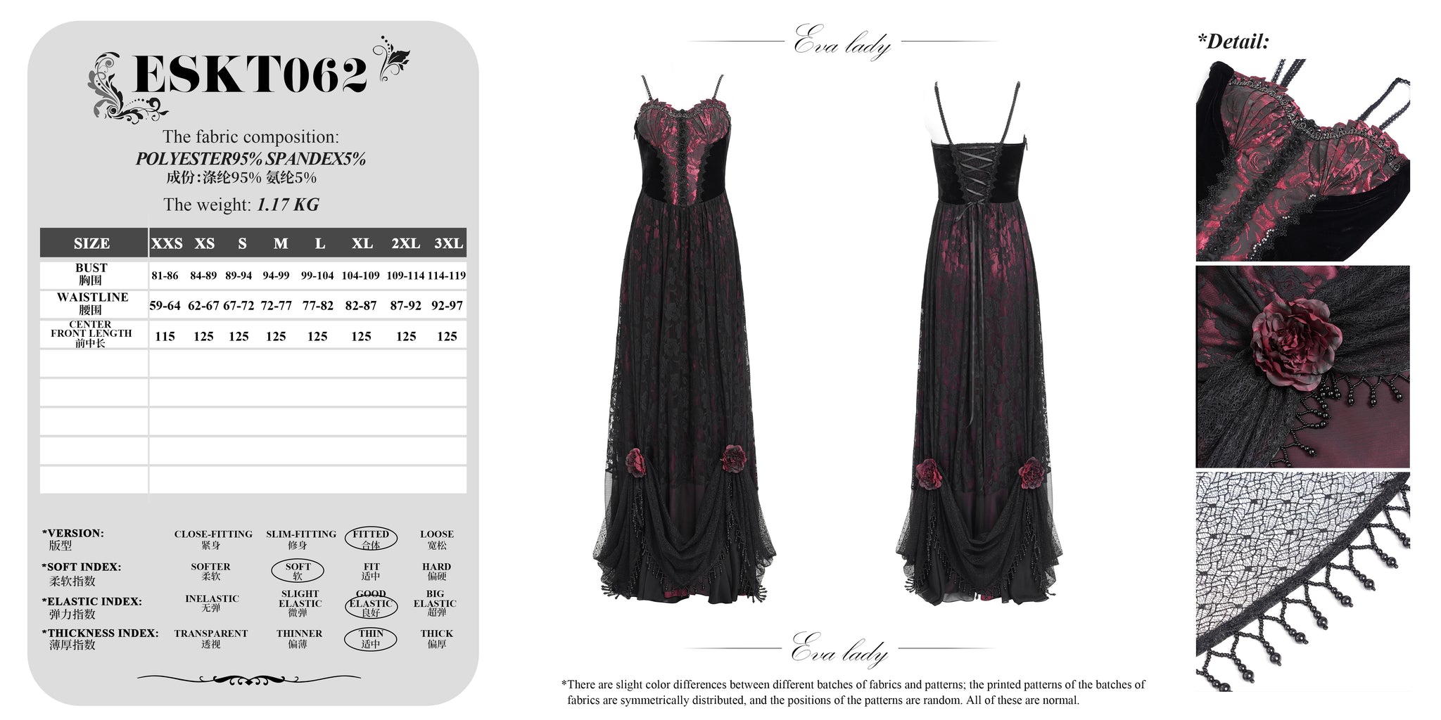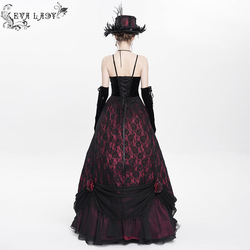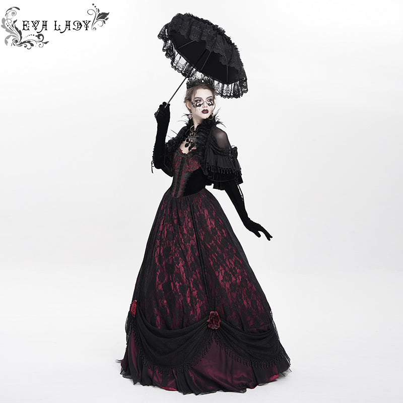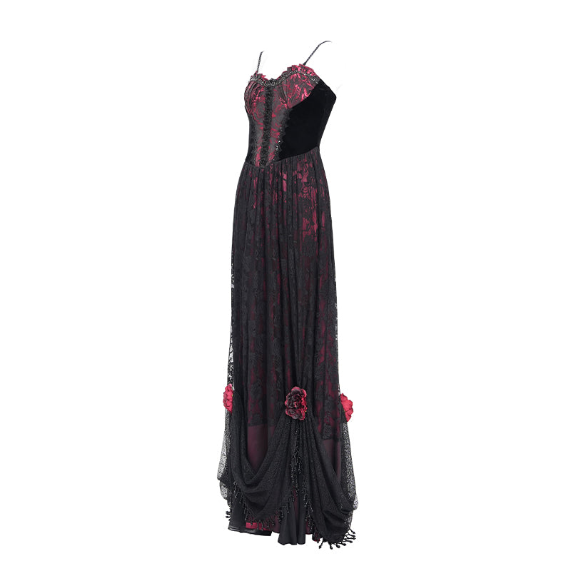 - The full skirt is crafted from burgundy satin, covered with rose-patterned lace.