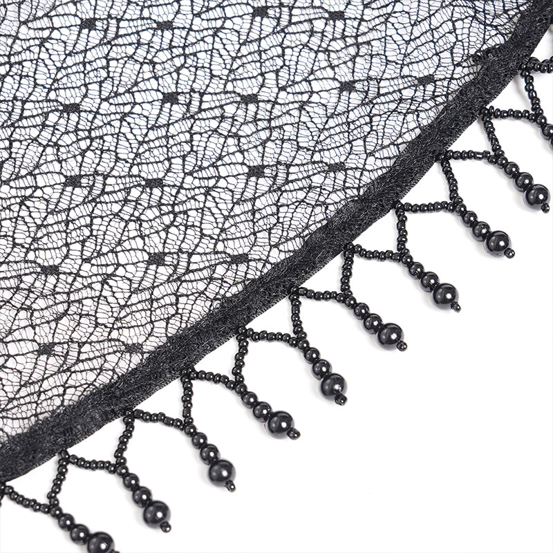 - The hem is layered with mesh drapes and chiffon, embellished with tassels and roses.