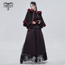 - The main fabric is made of black double-sided woolen fabric, the edge of the hat is joined with red fake hair, and the hem of the shawl is made into a petal shape, decorated with red fake hair and red lace.