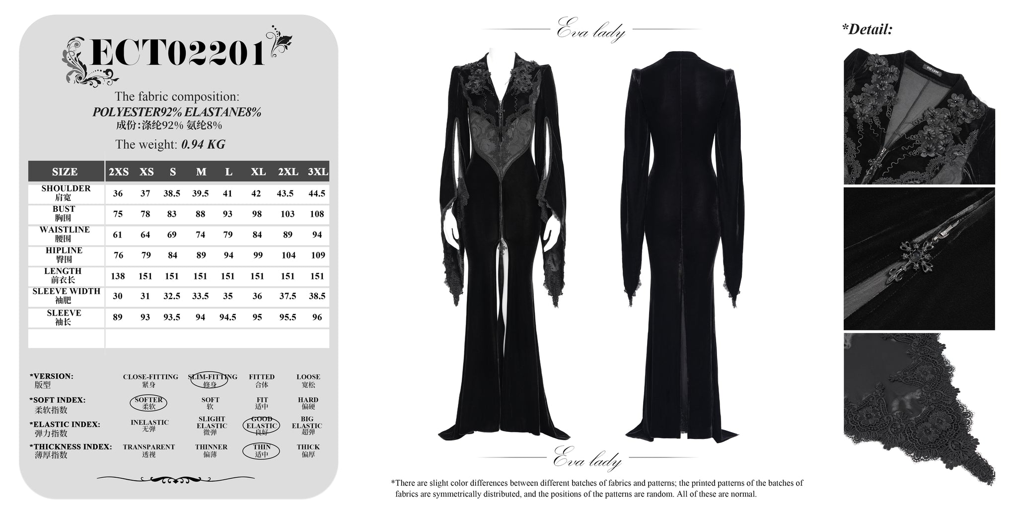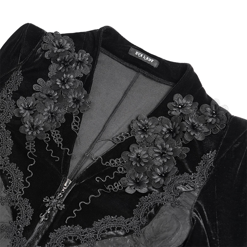 - The main fabric is made of stretch velvet, with three-dimensional lace on the shoulders and rose jacquard fabric at the waist, which is like a corset.