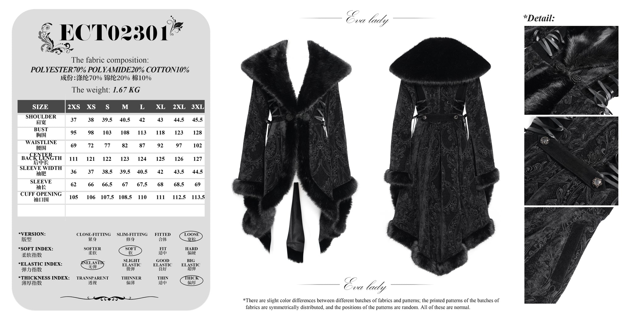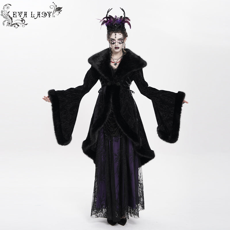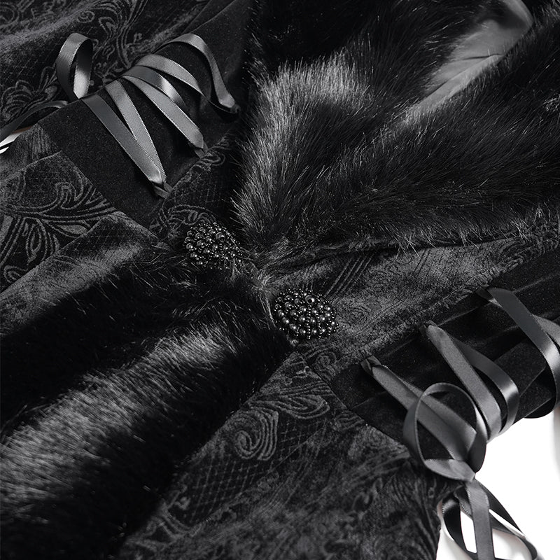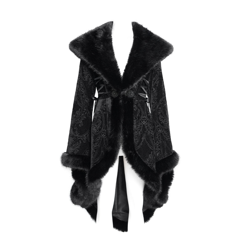 - The main fabric is made of thick jacquard velvet, with a big fur lapel and fur strips on the hem and cuffs for added warmth and layering.