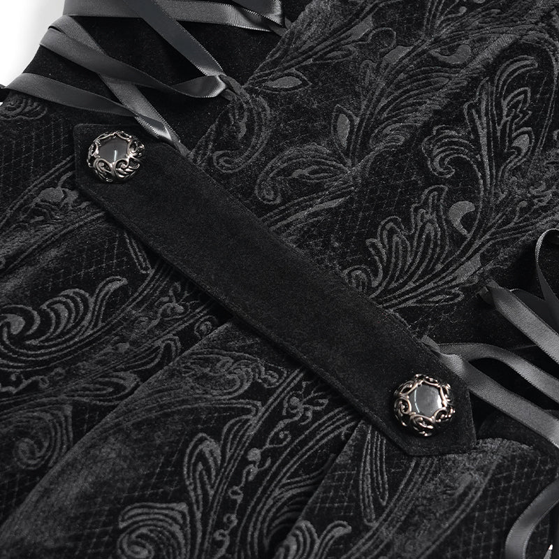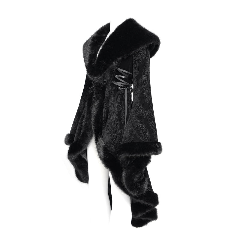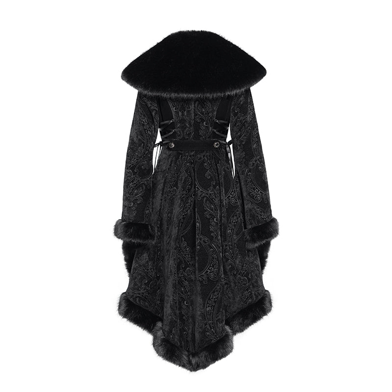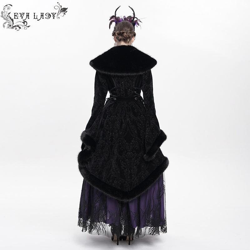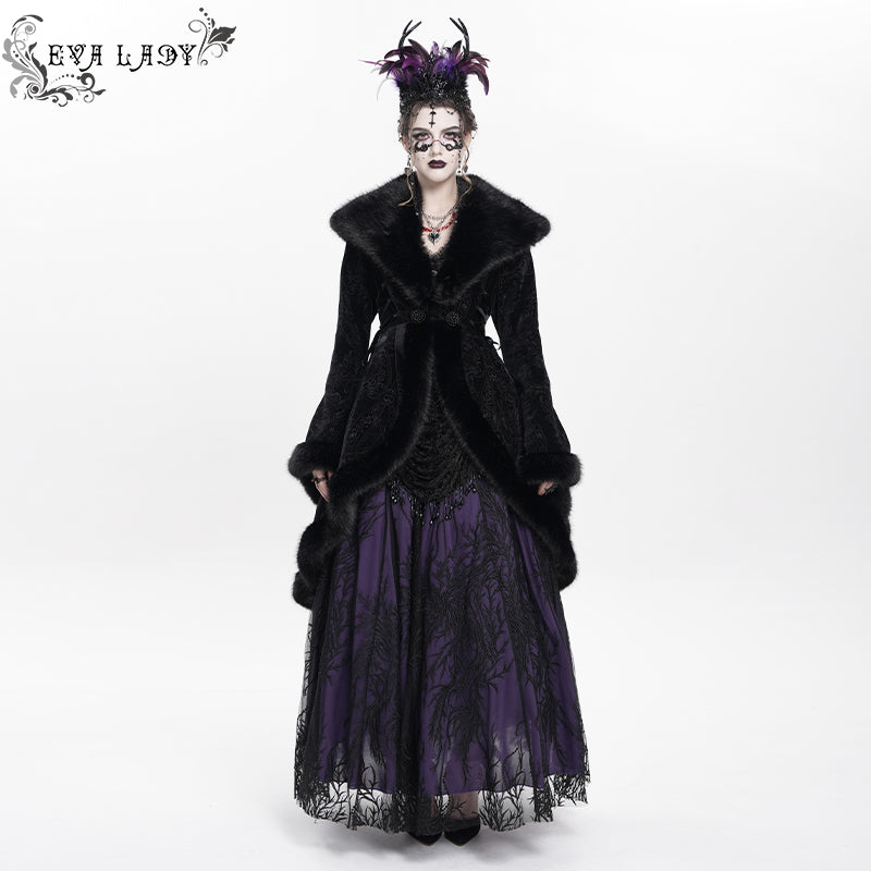 - The main fabric is made of thick jacquard velvet, with a big fur lapel and fur strips on the hem and cuffs for added warmth and layering.