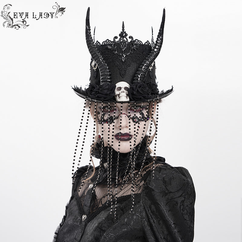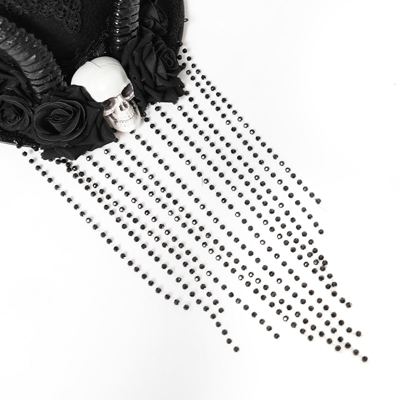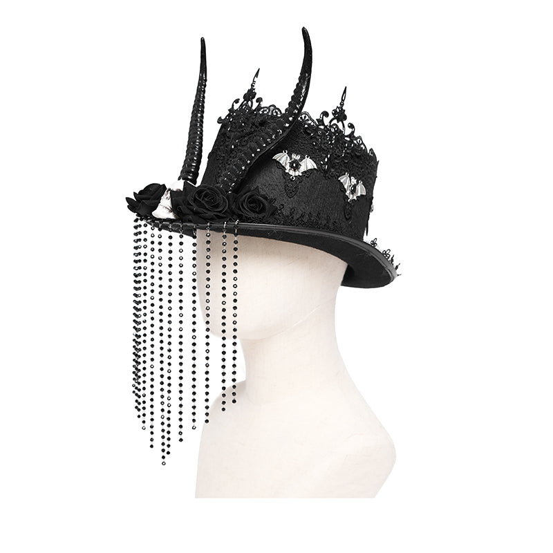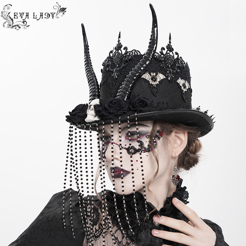 - The top hat is decorated with lace and metal bats all around, with sheep horns, skulls and roses in the middle, and a beaded chain hand-sewn onto the brim to form a veil.