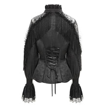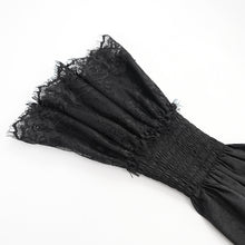 - The main material is patterned satin, with a low V neck design, patchwork mesh material on the shoulders, three-dimensional flowers on the collar, long lace tassels on both sides of the sleeves, and a rope in the center back to adjust the tightness.