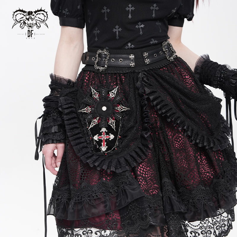 • It's adorned with a large red cross and a red diamond cross chain.