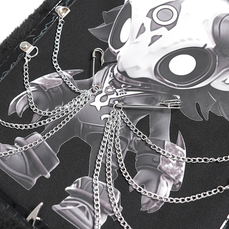 - The front of the backpack is printed with a "Hiett" pattern on the twill fabric, the chain decoration is removable, and the surrounding leather straps are hit with a circle of claw nails.