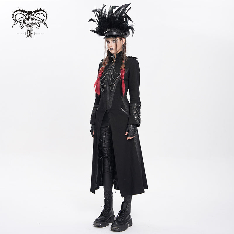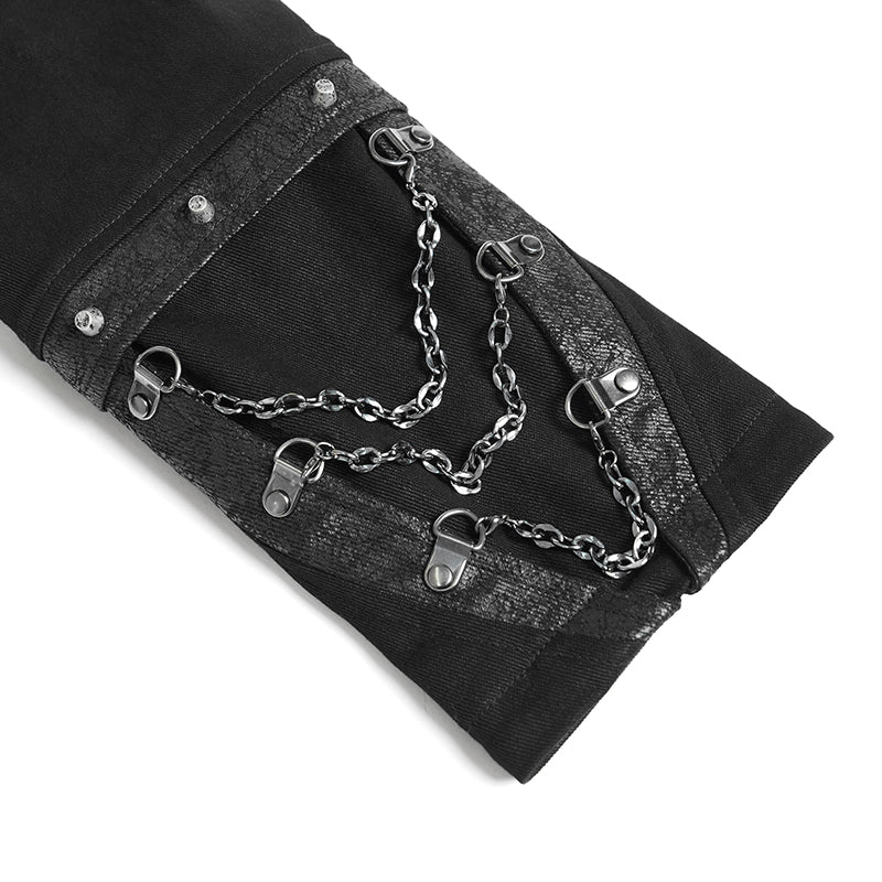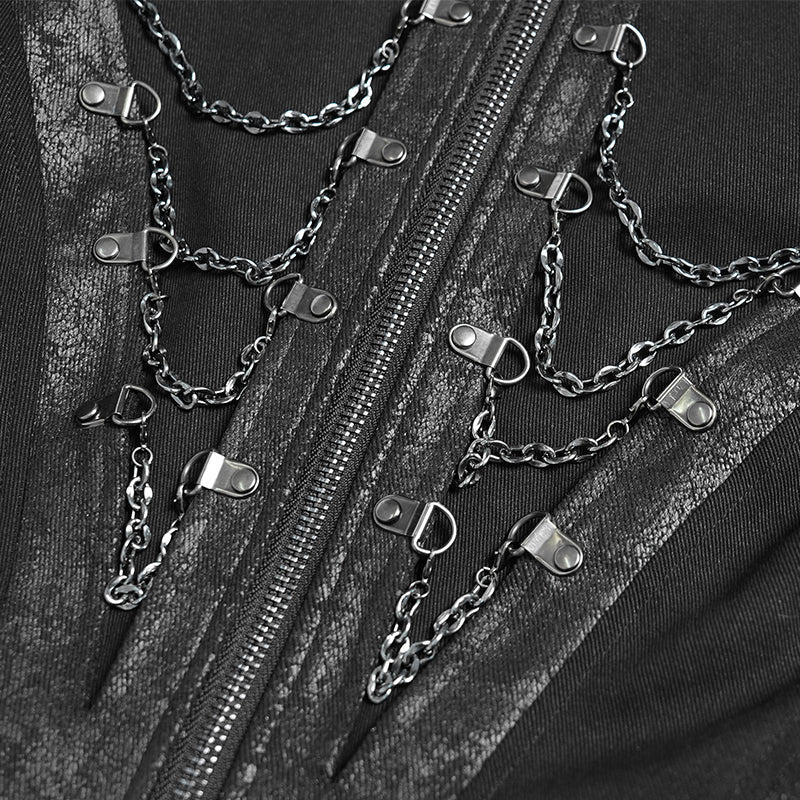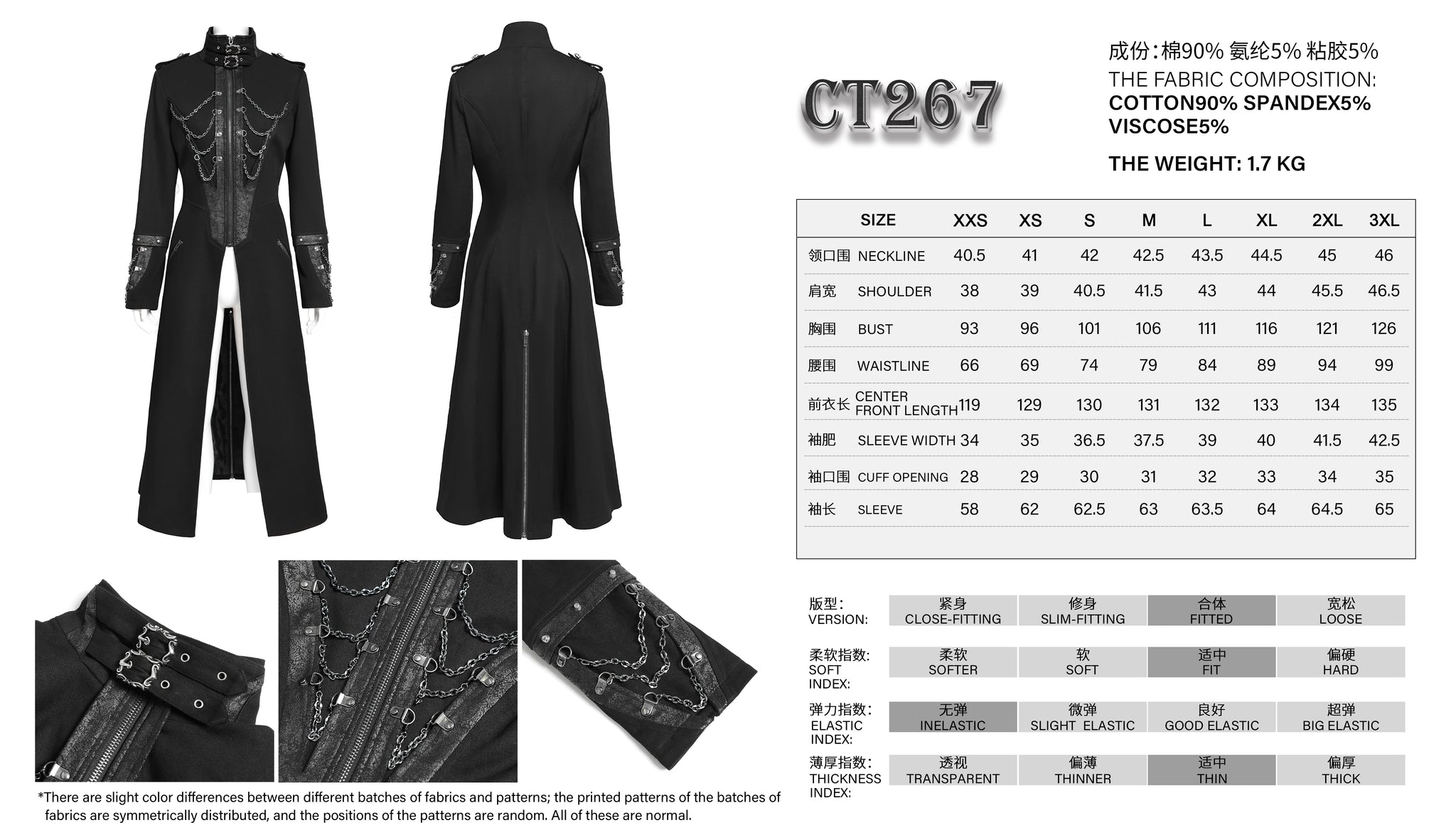 - The main material is coarse twill fabric, matched with coarse imitation leather material, with chains hanging on the chest and cuffs, which can be removed, and the zipper in the middle of the back opens the slit.