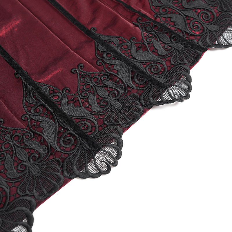 - Made entirely of burgundy shimmering fabric, it features a cross-patterned window pattern embroidered on the front skirt, pagoda lace stitching throughout the hem, and black velvet ribbon stitched along the hem.