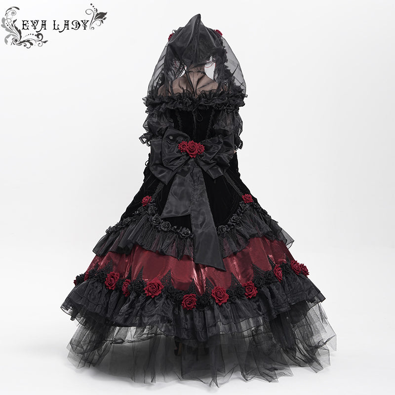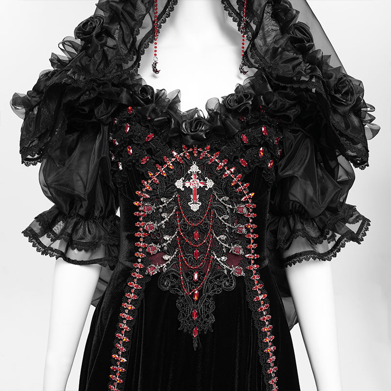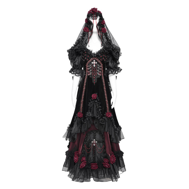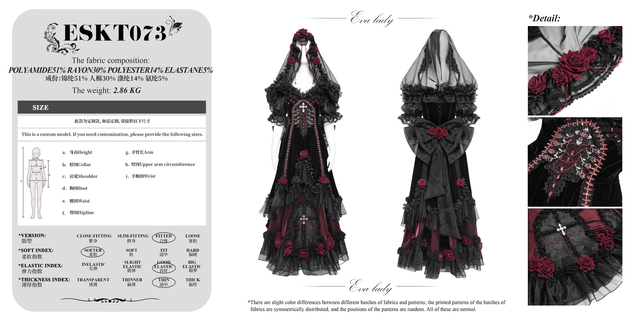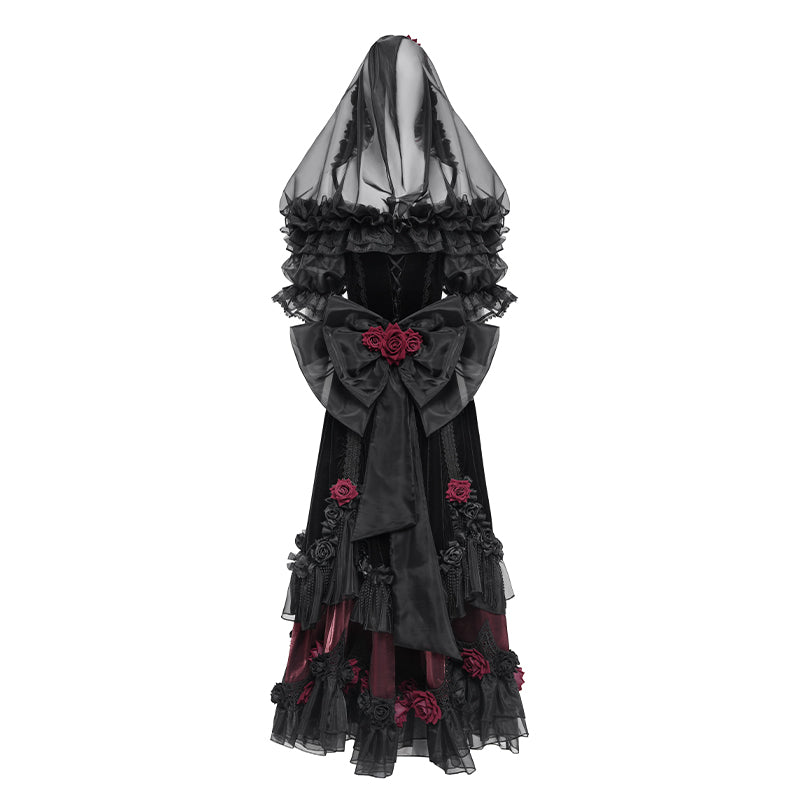 - The main material is velvet, the hem is dark red woven material, the hat is made of organza, the raw edge is gathered, and the hat is decorated with hand-sewn three-dimensional flowers and chains.