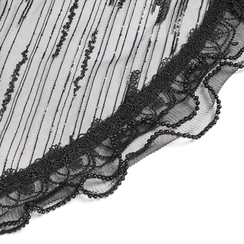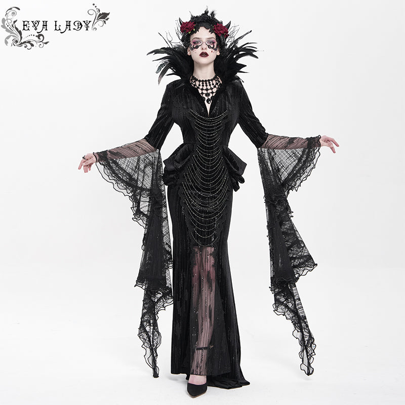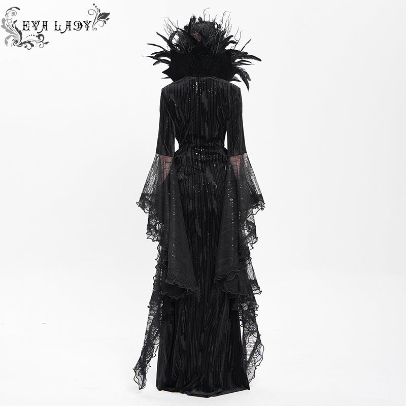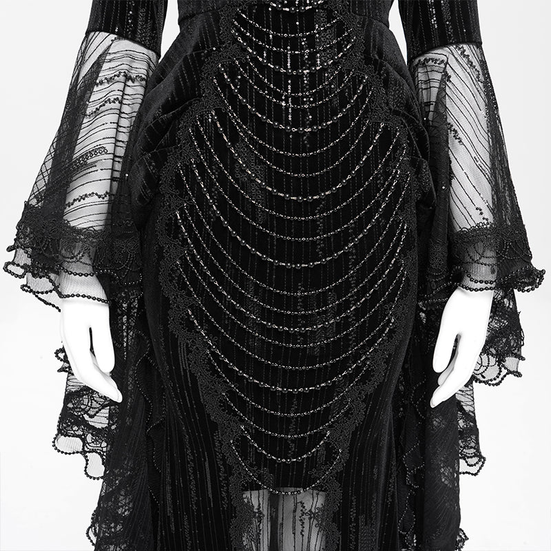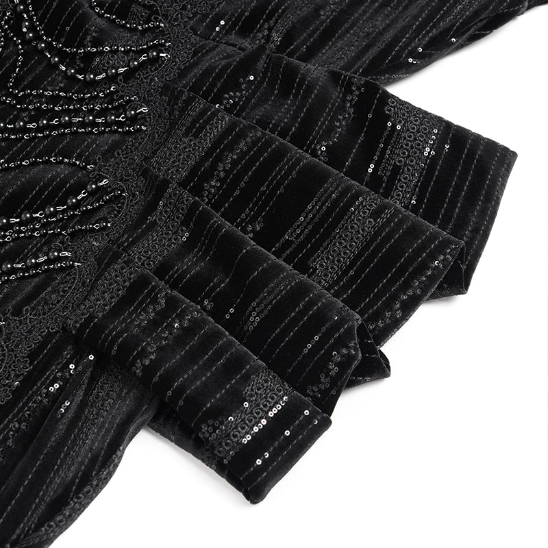 - The main fabric is velvet embroidered with vertical sequins, while the extra-long ruffled sleeves and center front hem are made of mesh with the same embroidered pattern.