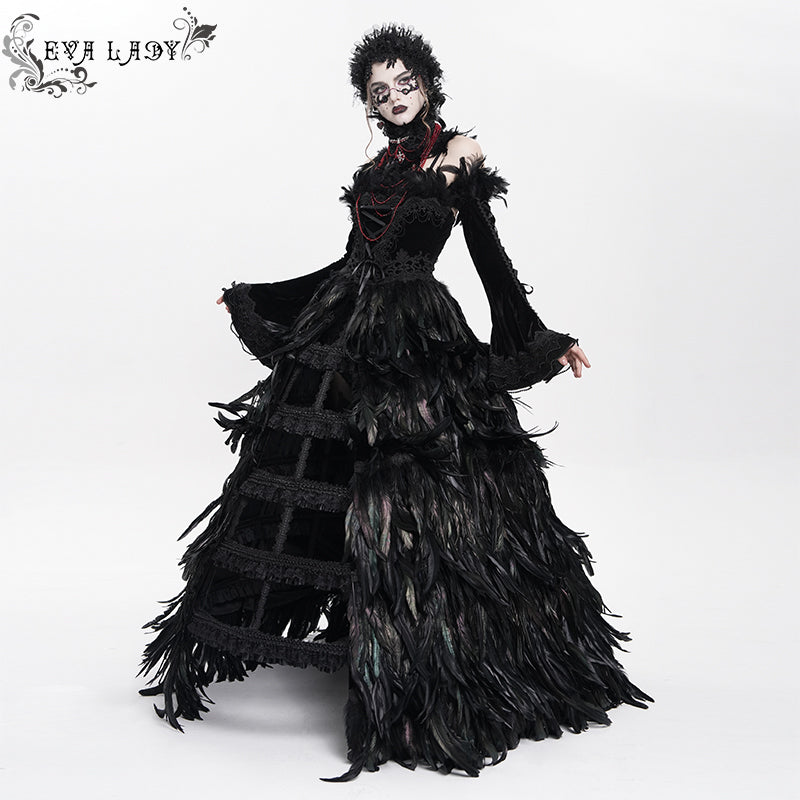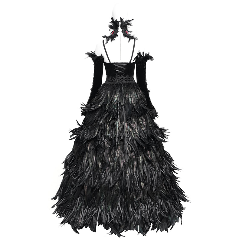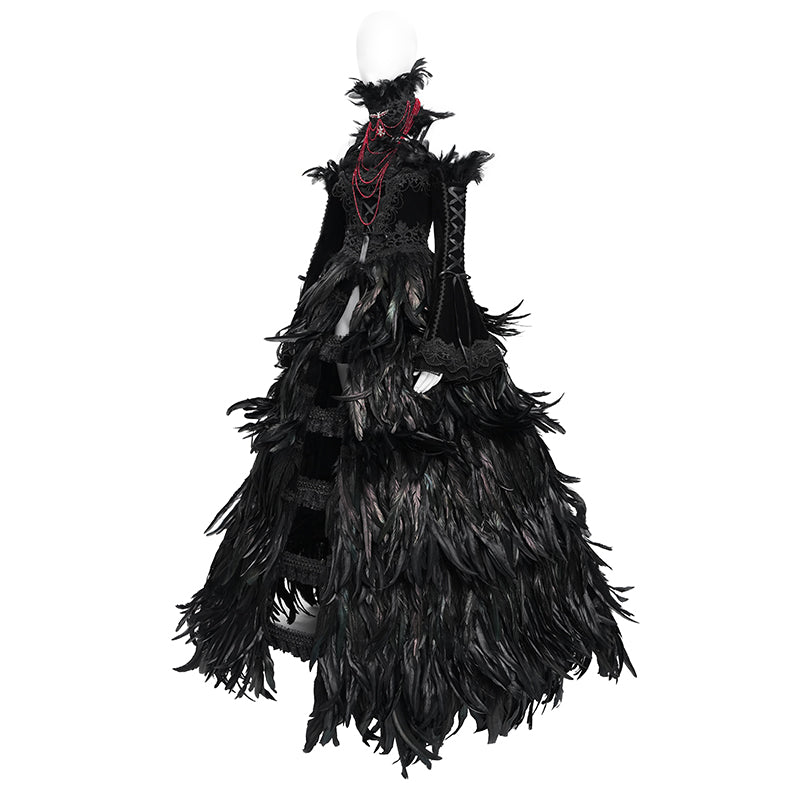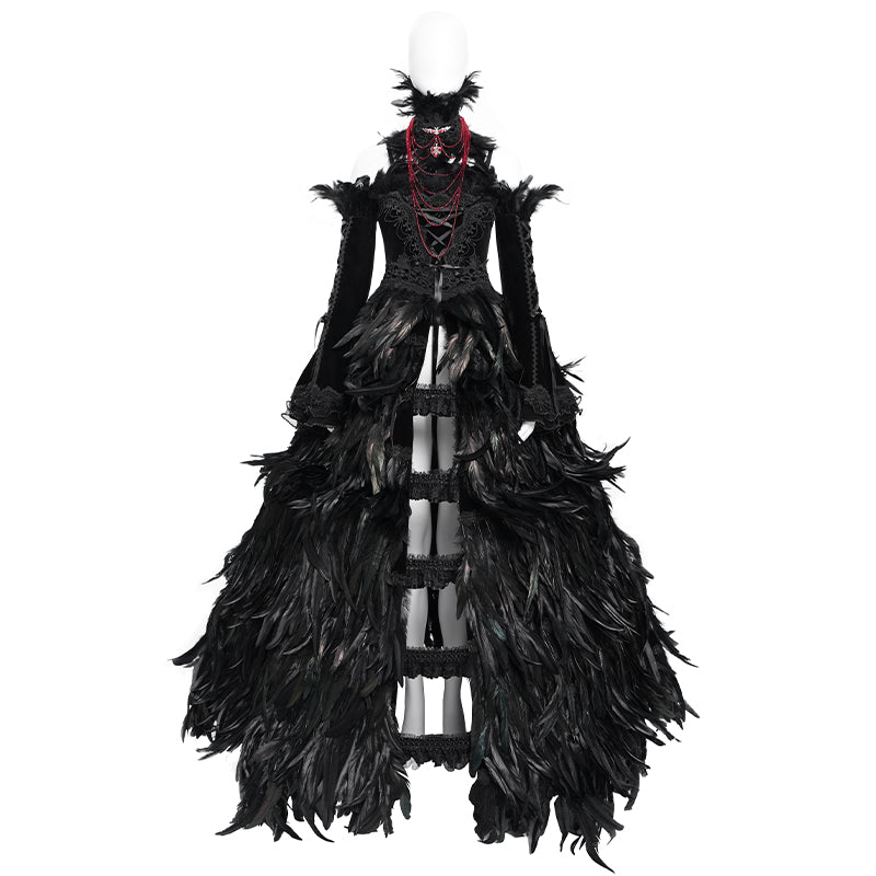 - Four-piece gown: a full-length feather dress, a lace steel-boned bustle, long velvet sleeves, and a red feather beaded neckpiece.