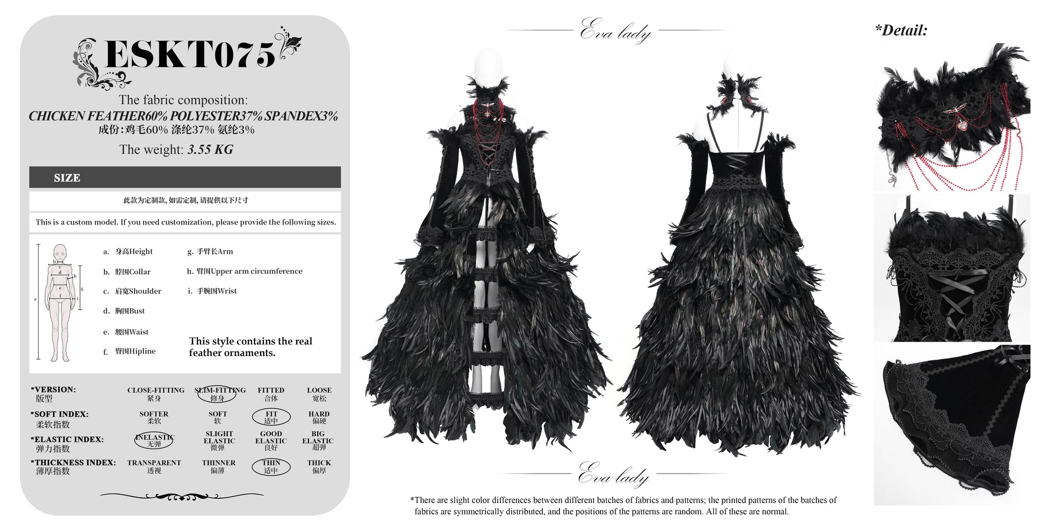 - Fabric:CHICKEN FEATHER60% POLYESTER37% SPANDEX3%