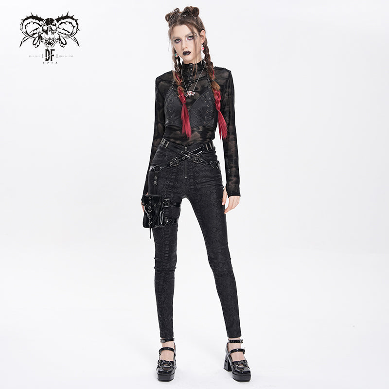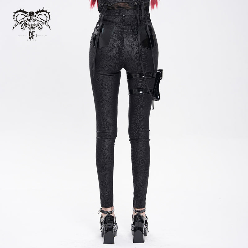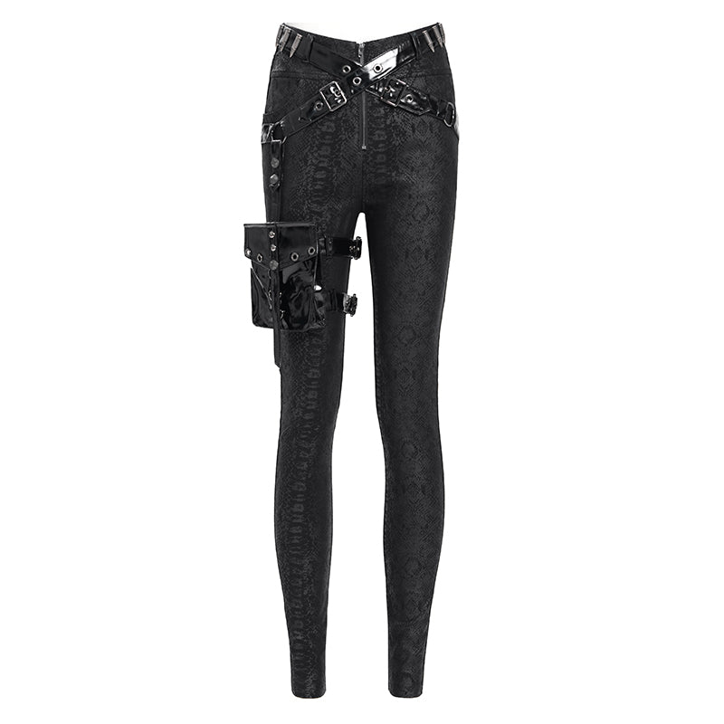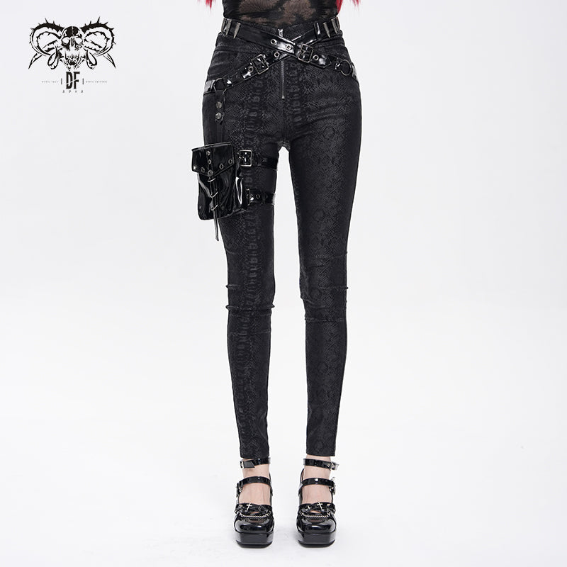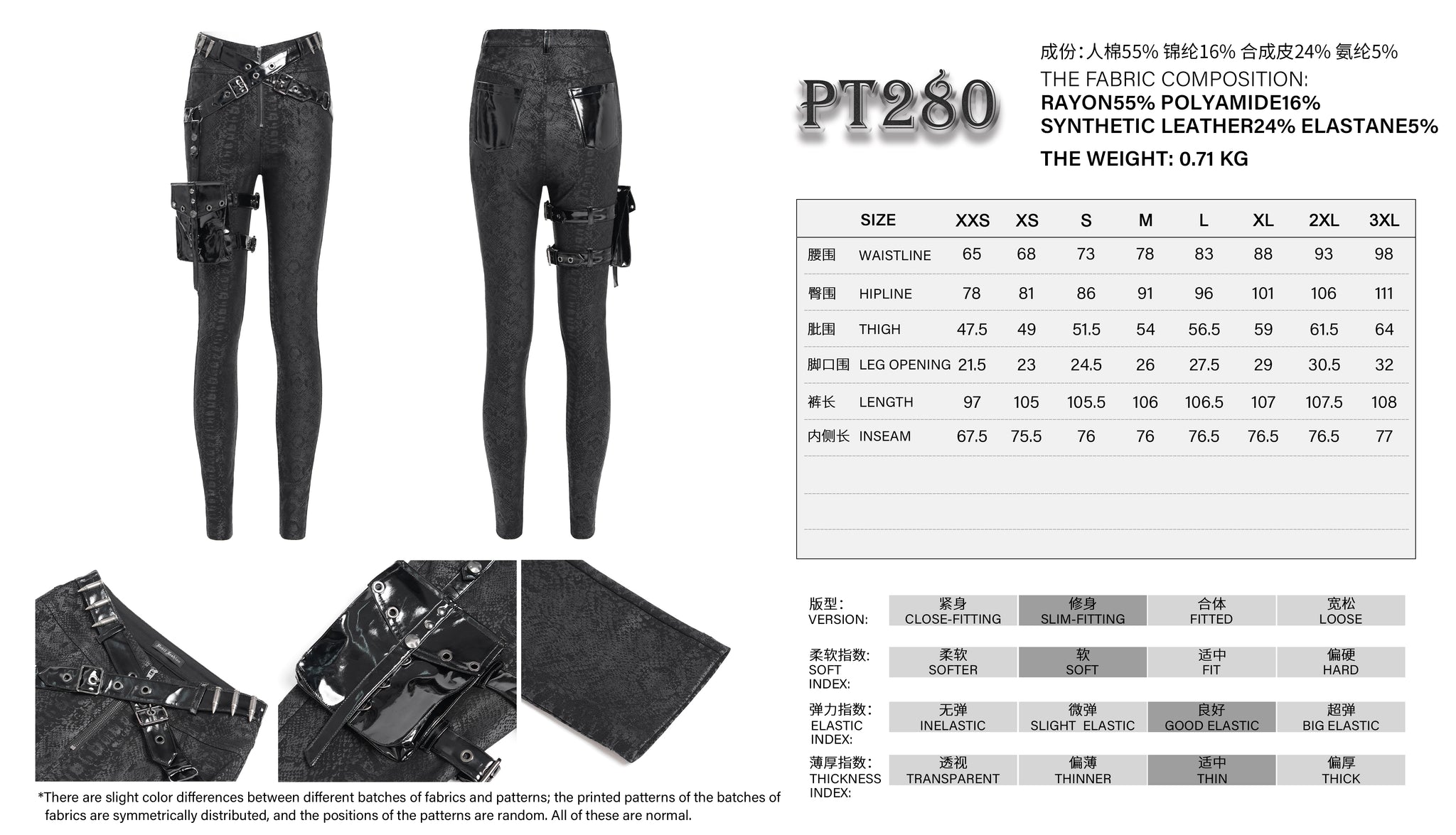 - The main material is snakeskin-patterned stretch knitted fabric, the trimmings are patent leather, the waist loop is decorated with hand-sewn metal, and the right leg has a three-dimensional pocket decoration, which can be removed.