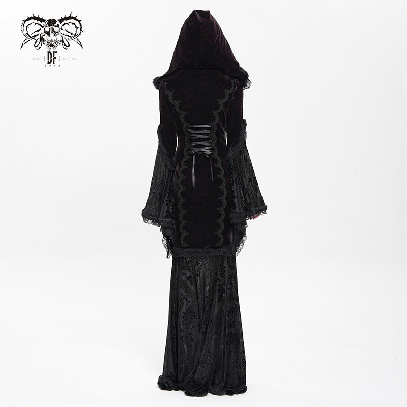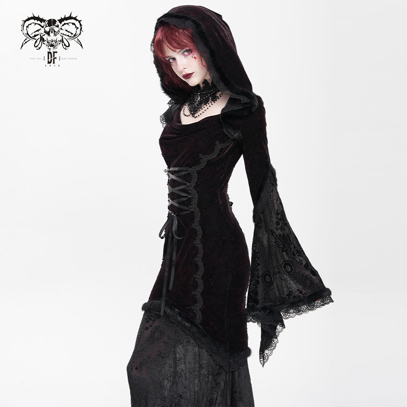 - Made from stretch velvet, this dress features a lace velvet hem, a hooded mermaid skirt, and full sleeves. Adjustable waist drawstrings at the front and back.