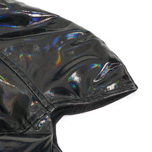 The main fabric is made of elastic dream color patent leather, with an exaggerated shoulder design, eyelet straps on the sleeves, and a diamond-shaped mesh on the inside to give the effect of wearing gloves inside.