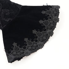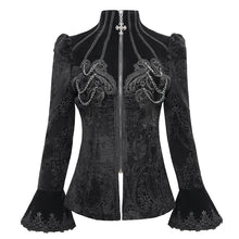- The main material is jacquard velvet, with solid color velvet decoration, lace and metal chain decoration on the chest (removable), slim fit version, flared sleeves.